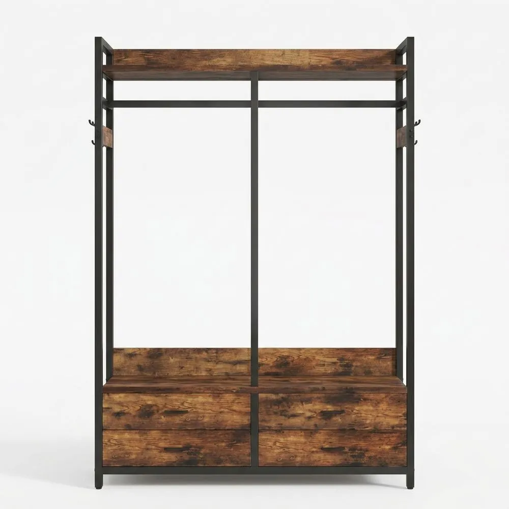 Schwarzer Stahlrahmen mit Regalböden und Kleiderstange 150x45x180cm
