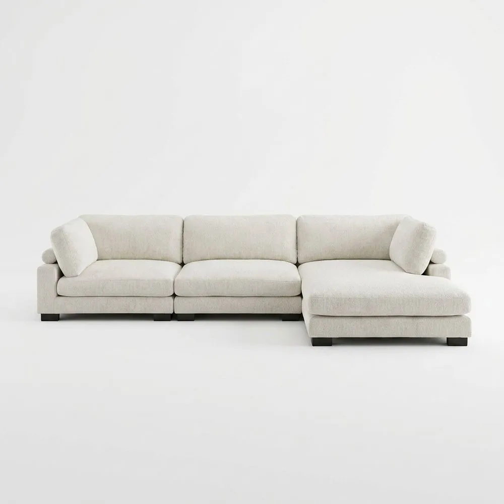 Dieses L-förmige Sofa hat ein Eichenholzgestell, das mit hochwertigem, cremefarbenem Polyesterstoff bezogen ist. Die Kissen sind mit Polyurethanschaum gefüllt. Es misst 300 cm x 200 cm x 85 cm und wiegt 75 kg. Der Bezug ist abnehmbar und kann mit einem feuchten Tuch gereinigt werden.