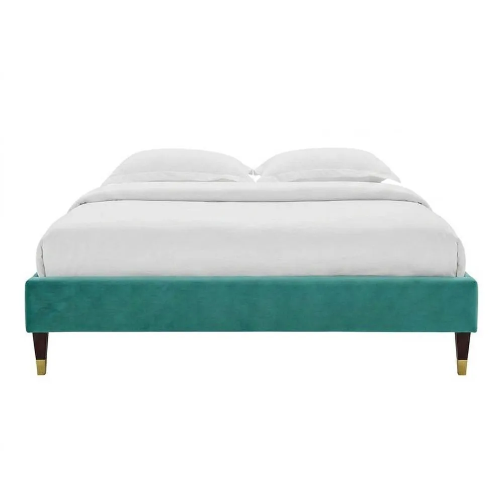 Dieses Polsterbett hat ein Eichenholzgestell, das mit türkisfarbenem Polyestersamt bezogen ist. Die Bettbeine bestehen aus einer Kombination von Eichenholz und beschichtetem Stahl.