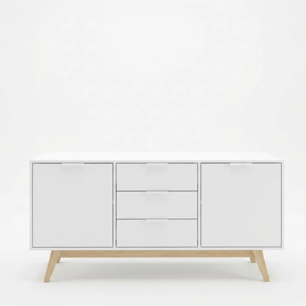 Die Kommode besteht aus MDF-Platten mit schrägen Eichenholzfüßen.